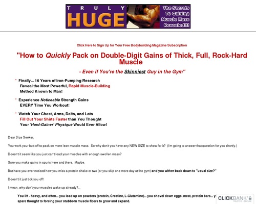 Finally after 16 years of training and research, I Discovered a training program that works for every bodybuilder every time! It’s called TRULY HUGE and is factually THE MOST POWERFUL MUSCLE BUILDING METHOD KNOWN! This bodybuilding program can boost your recuperation abilities, allowing you to INCREASE YOUR STRENGTH EVERY WORKOUT AND MAKE SIZE GAINS