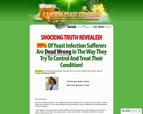My name is Martha G Brown. I am a medical and nutrition researcher and I’ve spent the last 17 years of my life doing heavy research on many topics dealing with fungal diseases, trying to understand the natural background of these conditions.I also happen to be a woman who suffered needlessly from annoying chronic yeast infections for more then 7 years. I spent a small fortune on vaginal sprays, creams and all kinds of remedies to deal with the vaginal discharge and fishy smell.Every day I was hating myself because I always had the itch and was sneaking away to the washroom at work to deal with it. I always felt unclean and no amount of showering could make me feel fresh again. I stopped having sex with my husband because it became too painful and I was so embarrassed.