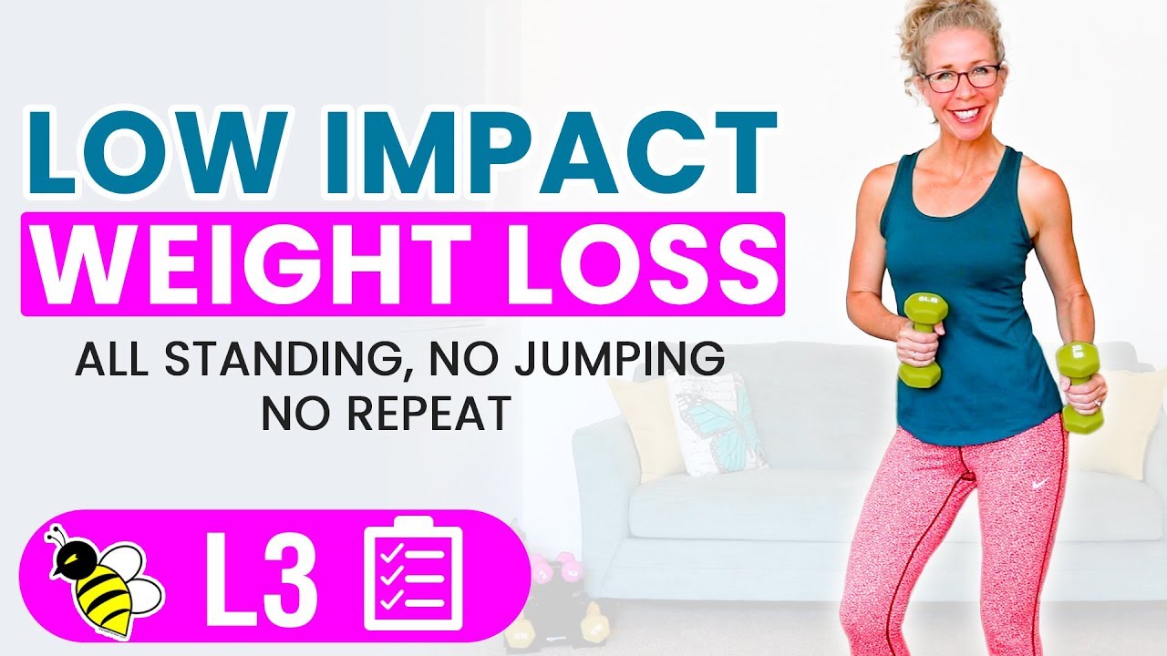 Level THREE | NO jumping, ALL standing, NO repeat | DUMBBELLS | BURN 250 – 300 calories Looking for a TOTAL BODY low impact WEIGHT LOSS workout?